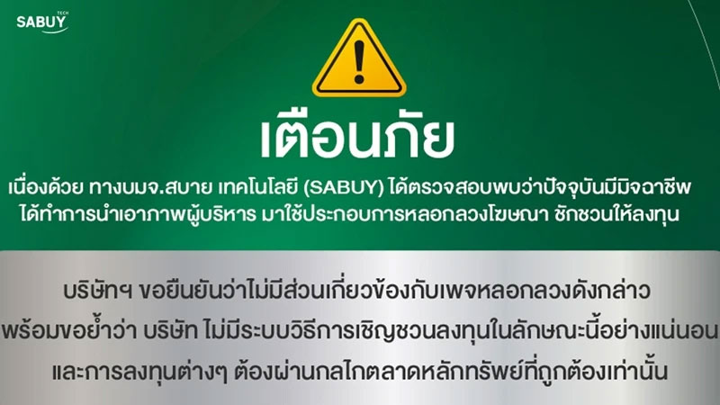 เนื่องด้วย ทางบมจ.สบาย เทคโนโลยี (SABUY) ได้ตรวจสอบพบว่าปัจจุบันมีมิจฉาชีพได้ทำการนำเอาภาพผู้บริหาร มาใช้ประกอบการหลอกลวงโดยการโฆษณาผ่านทางโซเชียลมีเดียเฟสบุค และสื่อโซเชียลต่าง ๆ เพื่อให้มีการเข้าร่วมกลุ่มทางแชท แอพพลิเคชั่นต่าง ๆ อาทิ โอเพ้นแชท (Open chat) และชักชวนให้ลงทุน กู้เงิน ซื้อกองทุนรวม เพื่อรับเงินปันผลสูง เข้าถือหุ้น หรือเปิดรับสมัครเทรดหุ้น โดยแอบอ้างชื่อบริษัท ภาพกิจการ ภาพผู้บริหารของบริษัท ทำให้บริษัทได้รับความเสียหาย และทำให้มีผู้ถูกหลอกลวงและได้รับความเสียหาย