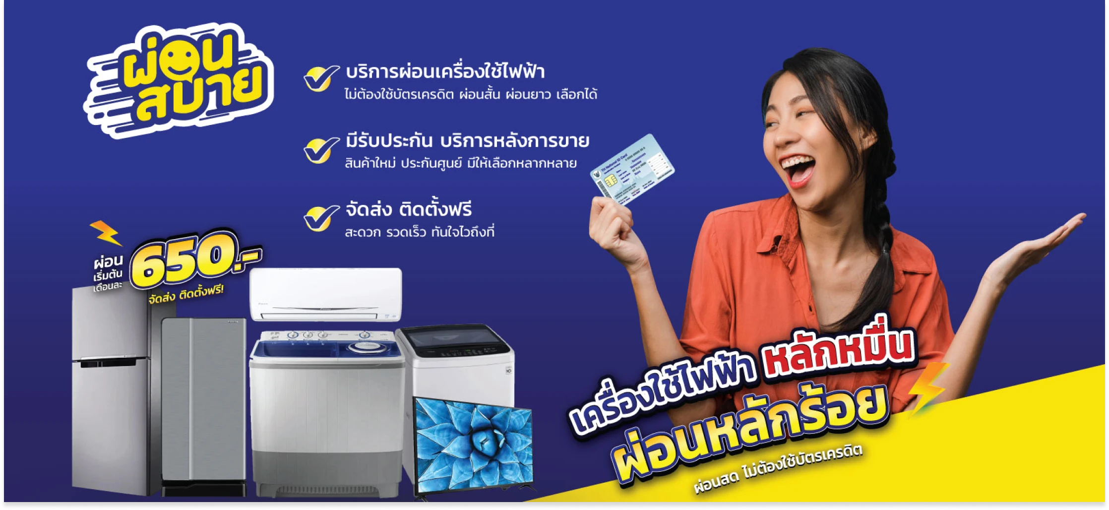 การให้บริการผ่อนชำระเครื่องใช้ไฟฟ้าแบรนด์ชั้นนำต่าง ๆ อาทิ ทีวี ตู้เย็น เครื่องซักผ้า เครื่องทำน้ำอุ่น เครื่องฟอกอากาศ ตู้แช่ด้วยการแบ่งจ่ายง่าย ๆ ไม่ต้องใช้บัตรเครดิต โดยมีทั้งช่องทางการให้บริการ: O2O (Online to Offline) และหน่วยเคลื่อนที่โมบายในเขตกรุงเทพฯ ปริมณฑล และเมืองใหญ่ ๆ ในต่างจังหวัด